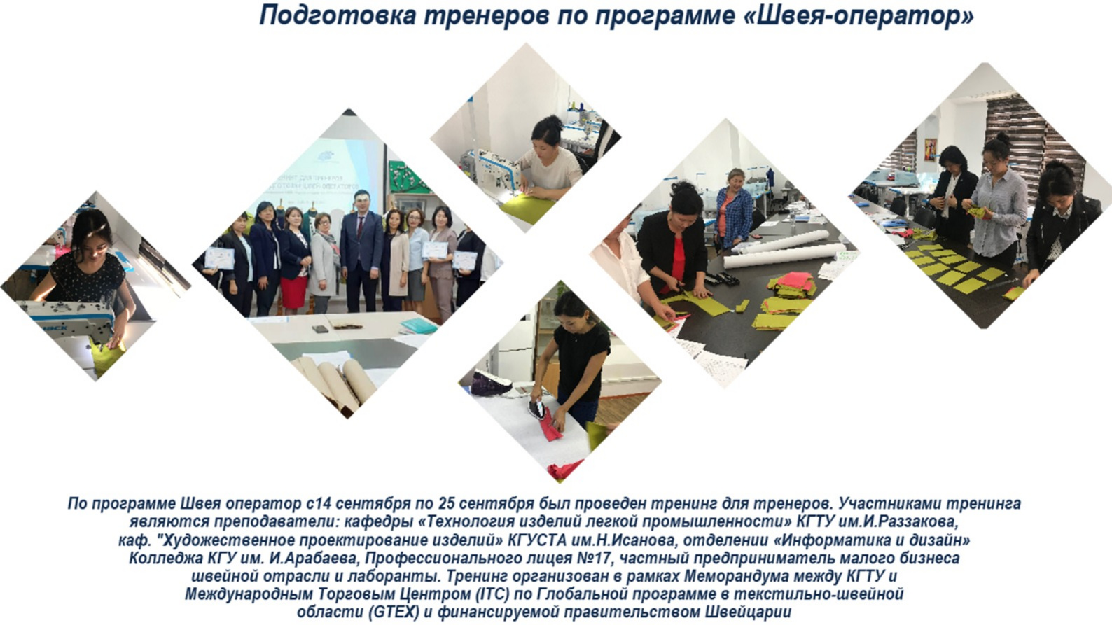 In den Jahren 2019-2024 wurde das Projekt im Rahmen des Programms zur Förderung des Handels in der Kirgisischen Republik umgesetzt, das mit technischer Unterstützung des Globalen Textil- und Bekleidungsprogramms (GTEX) des Internationalen Handelszentrums (ITC), das von der Regierung der Schweiz finanziert wird, durchgeführt wurde. Das Projekt zielte darauf ab, das Exportpotenzial der Textil- und Bekleidungsindustrie zu stärken, die Wettbewerbsfähigkeit der heimischen Unternehmen zu erhöhen und das Ausbildungssystem zu verbessern.
