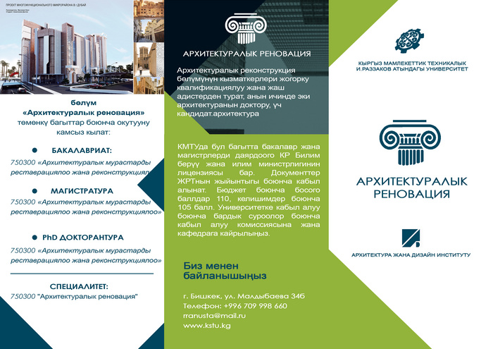 Die Abteilung für Restaurierung und Rekonstruktion des architektonischen Erbes ist die einzige Abteilung in Zentralasien, die seit 1998 Architekten-Restauratoren ausbildet.