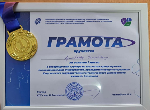 25 октября 2025 года в Кыргызском государственном техническом университете им. И. Раззакова состоялся товарищеский турнир по шахматам среди мужчин, посвящённый Дню университета и проводимый среди сотрудников. В этом турнире первое место занял к.т.н., доцент кафедры «Физика» Азимбаев Т.