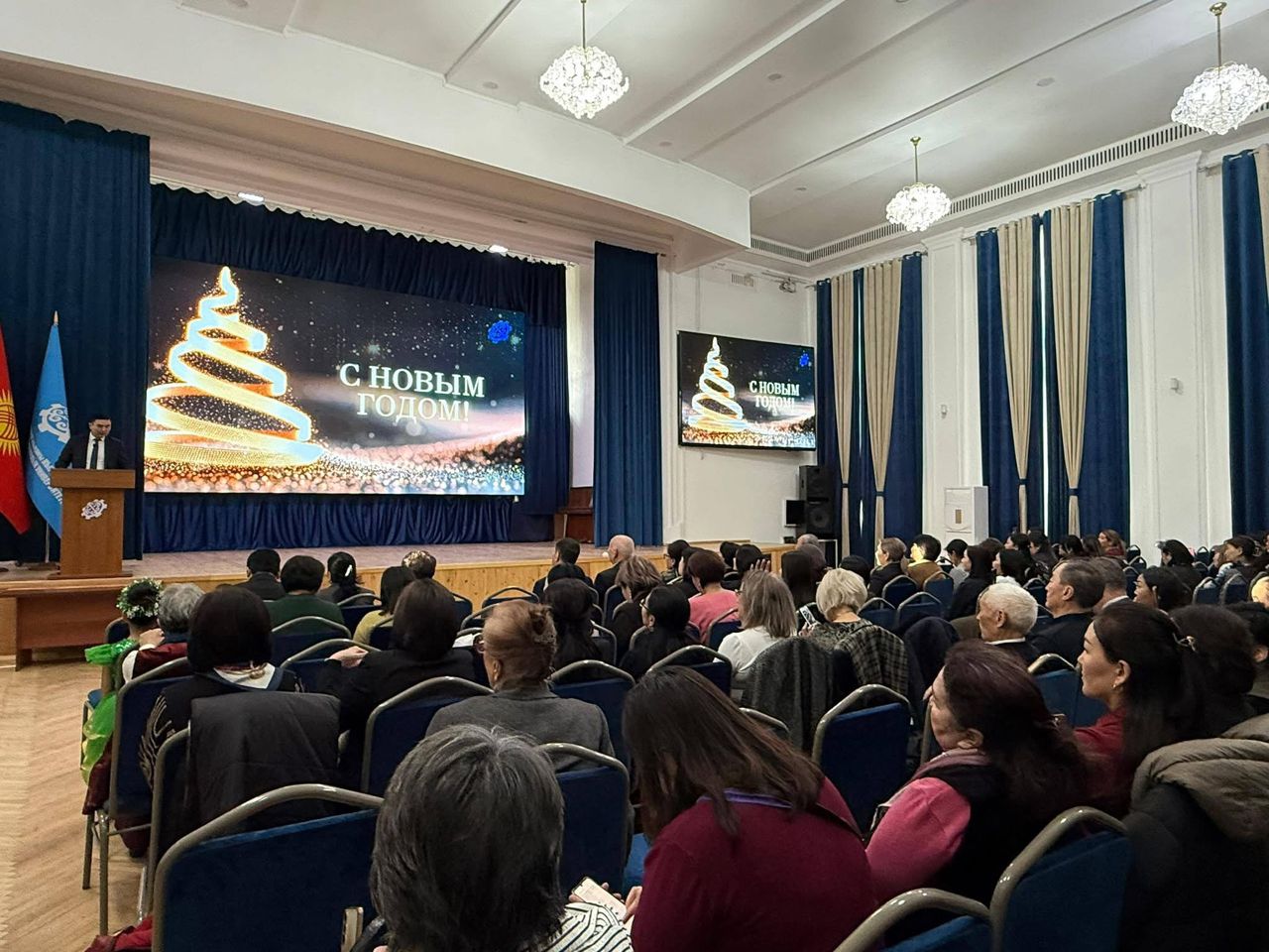 С приветственным словом и новогодними поздравлениями выступил ректор университета Мирлан Койчубекович Чыныбаев. Он поздравил
