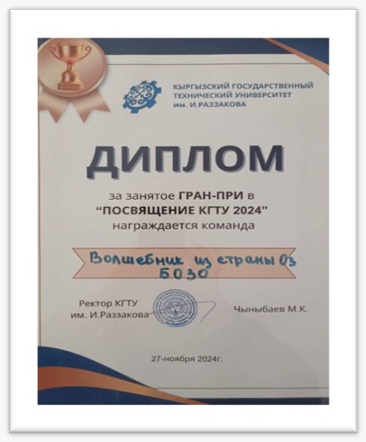 Айтбаева Акылай, студент группы БТ(б)-1-21, по результатам 2024-2025 учебного года удостоена президентской стипендии за особые достижения в учебной, научно-творческой и общественной деятельности. Также, Айтбаева Акылай заняла 1-е место в стартап-конкурсе КГТУ и была награждена денежной премией в размере 30000 сомов.