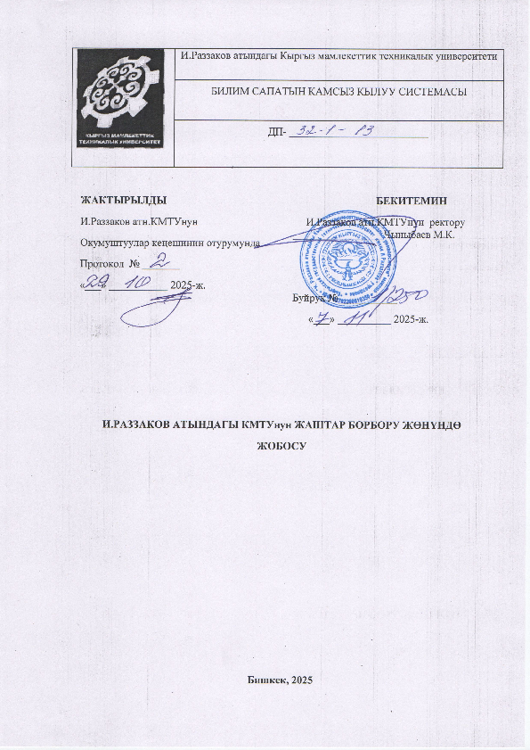 Положение о департаменте по воспитательной работе в КГТУ им. И.Раззакова