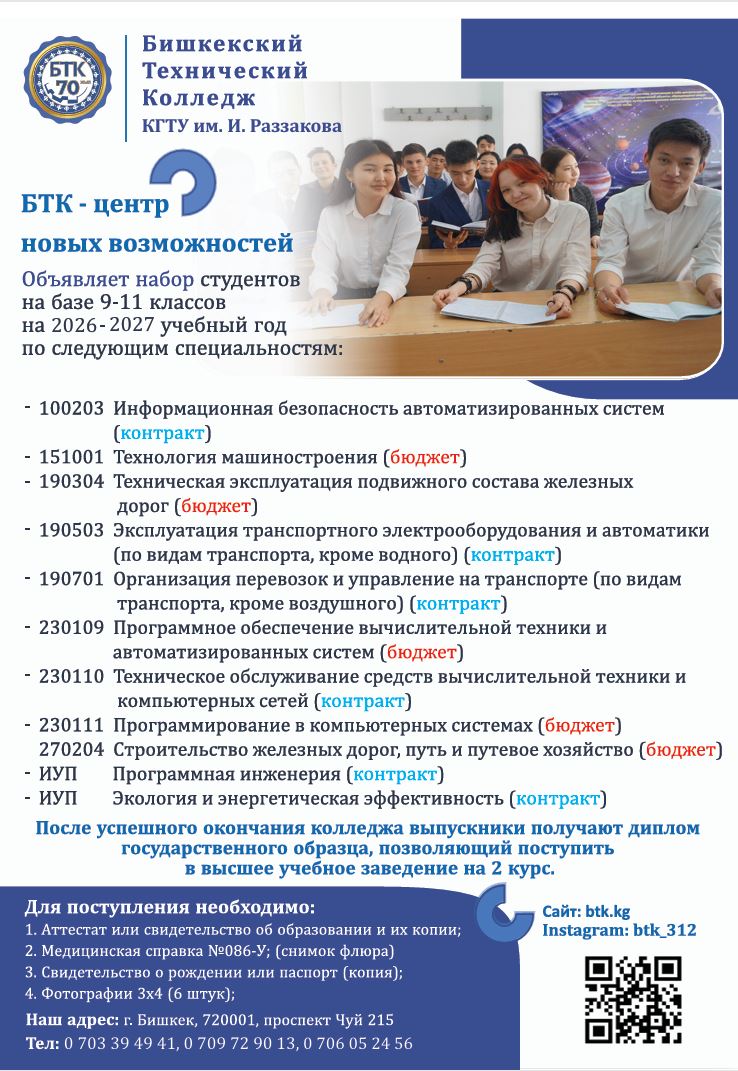 Bishkek Technical College offers a wide range of specialties that lead to success and stable income across various fields of professional activity. Our programs have always been, and will continue to be, promising, well-paid, and in demand!