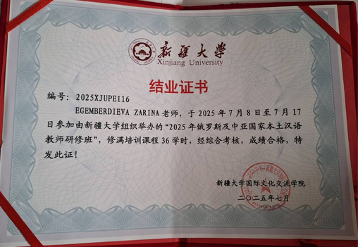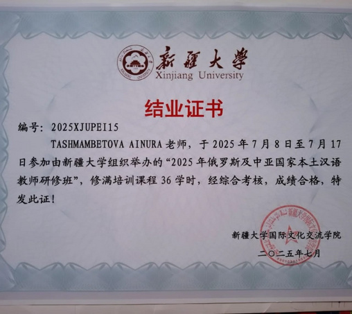 Faculty members of the Artistic Design Department, senior lecturer Zarina Davletovna Egemberdieva and teacher Ainura Bolotbekovna Tashmambetova from KSTU named after I. Razzakov, completed a 10-day advanced training course in Chinese language proficiency at Xinjiang University, China, Urumqi, from July 7 to July 18, 2025.To strengthen academic mobility and develop joint art projects with this university and a university located further away from Xinjiang University, the faculty presented the creative activities and interests of the KhPI department and exchanged gifts and contacts.Collaboration between universities will facilitate the exchange of experience and knowledge in the field of education, enhance the potential of research activities at universities, and improve the quality of education for students in the department. The delegation included 12 faculty members from BSU and two faculty members from the KhPI department