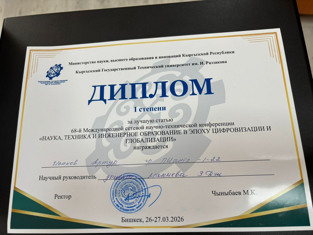Наш студент группы ПИ(анг)-1-22 Исаков Артур занял 1 место среди студентов КГТУ им. И. Раззакова и был награждён Дипломом I степени за лучшую научную статью, представленную в рамках 68-й Международной научно-технической конференции «Наука, техника и инженерное образование в эпоху цифровизации и глобализации».