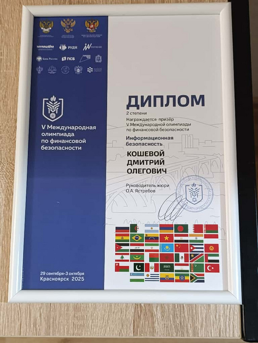 С 29 сентября по 3 октября состоялся финальный тур V Международной олимпиады по финансовой безопасности, которая проходила в городе Красноярск Российской Федерации. Участие в ней приняли более 600 студентов из 40 стран БРИКС по указанным 4 направлениям. В числе призёров в этот раз - 3 студента из Кыргызстана по направлениям Международные отношения, Экономическая безопасность и Информационная безопасность. По направлению Информационной безопасности студент кафедры ПОКС Дмитрий Кошевой получил диплом второй степени.