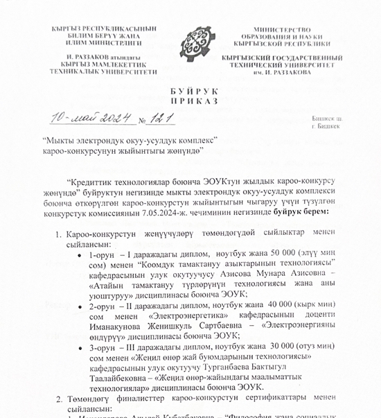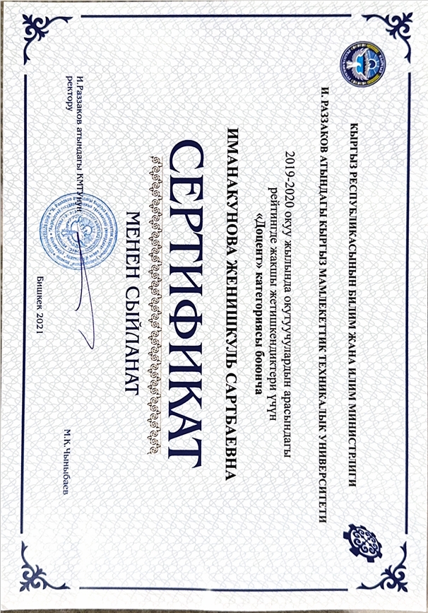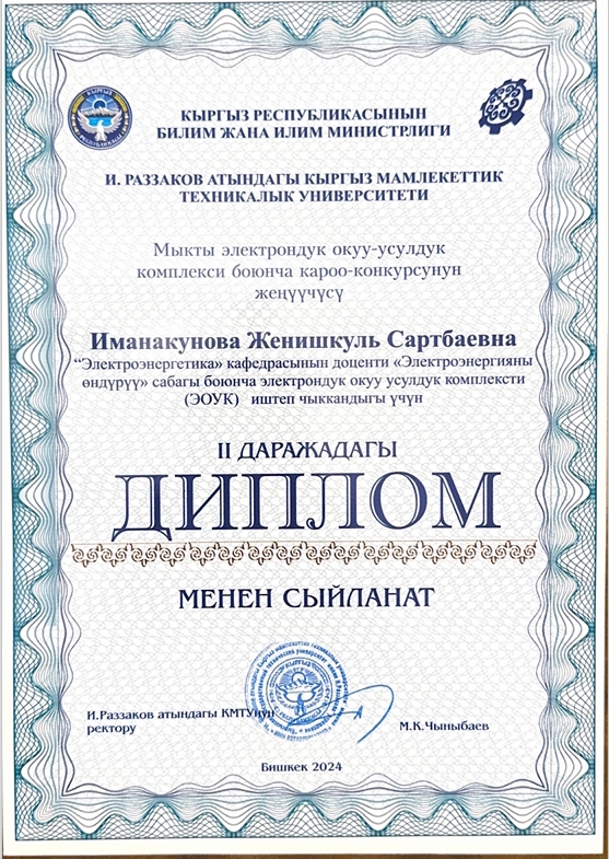 Почетные профессора кафедры «Электроэнергетика»: Водянов А.Р. Генеральный директор ОСОО «Электросила»; Дикамбаев Ш.Б. в.н.с. «НИИЭ» при Министерстве энергетики КР; Исмаилов К.Б. Начальник ПТО ОАО «НЭСК».