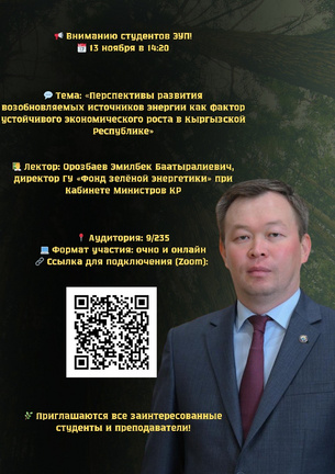 13 ноября 2025 года в рамках Недели науки Кыргызской Республики состоялась гостевая лекция на тему «Перспективы развития возобновляемых источников энергии как фактор устойчивого экономического роста в Кыргызской Республике». Мероприятие…
