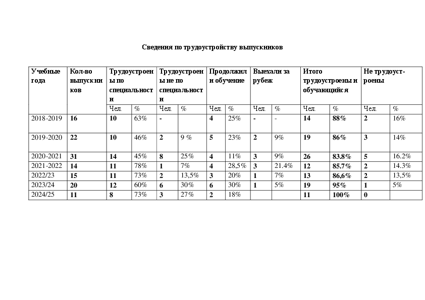 В рамках образовательных программ кафедры проводится системная работа по мониторингу трудоустройства выпускников, а также их карьерного роста. Одним из основных критериев оценки уровня подготовки выпускников является их востребованность предприятиями. Мониторинг трудоустройства показывает высокие результаты – в пределах от 85-100%. %. Наши выпускники успешно работают на многих ведущих предприятиях пищевой промышленности, что свидетельствует о высоком уровне подготовки специалистов. На уровне института и университета ежегодно проводятся мероприятия с представителями производств, ярмарки вакансий, круглые столы, семинары где также озвучивают вакантные места на производствах. Стабильный карьерный рост наших выпускников подтверждает высокий уровень качества образовательной программы с одной стороны, конкурентоспособность выпускников на рынке труда и соответственно, залог их трудоустроенности, с другой стороны. Ниже представлена статистическая информация по трудоустроенности выпускников образовательных программ кафедры «Машины и аппараты пищевых производств»