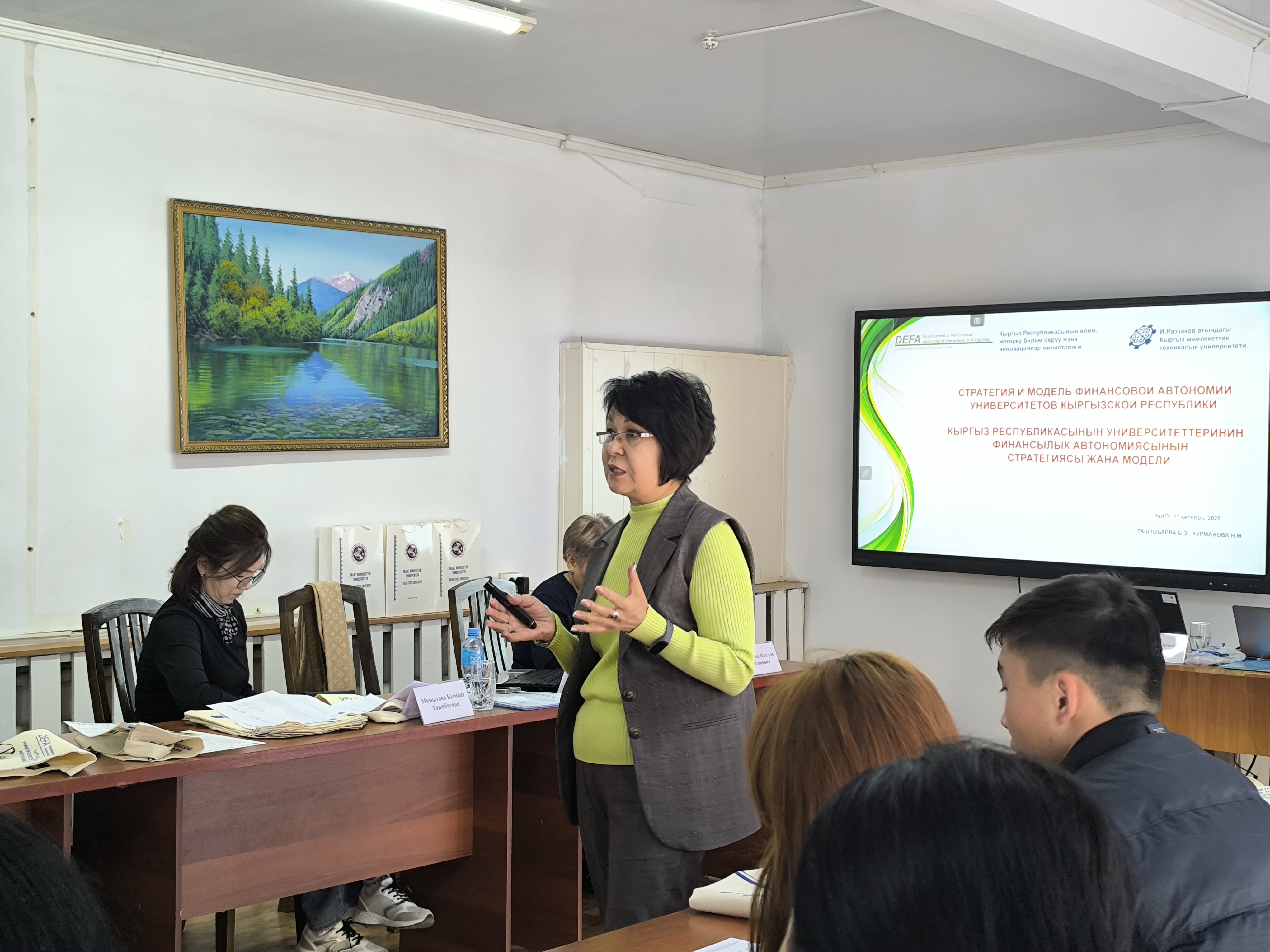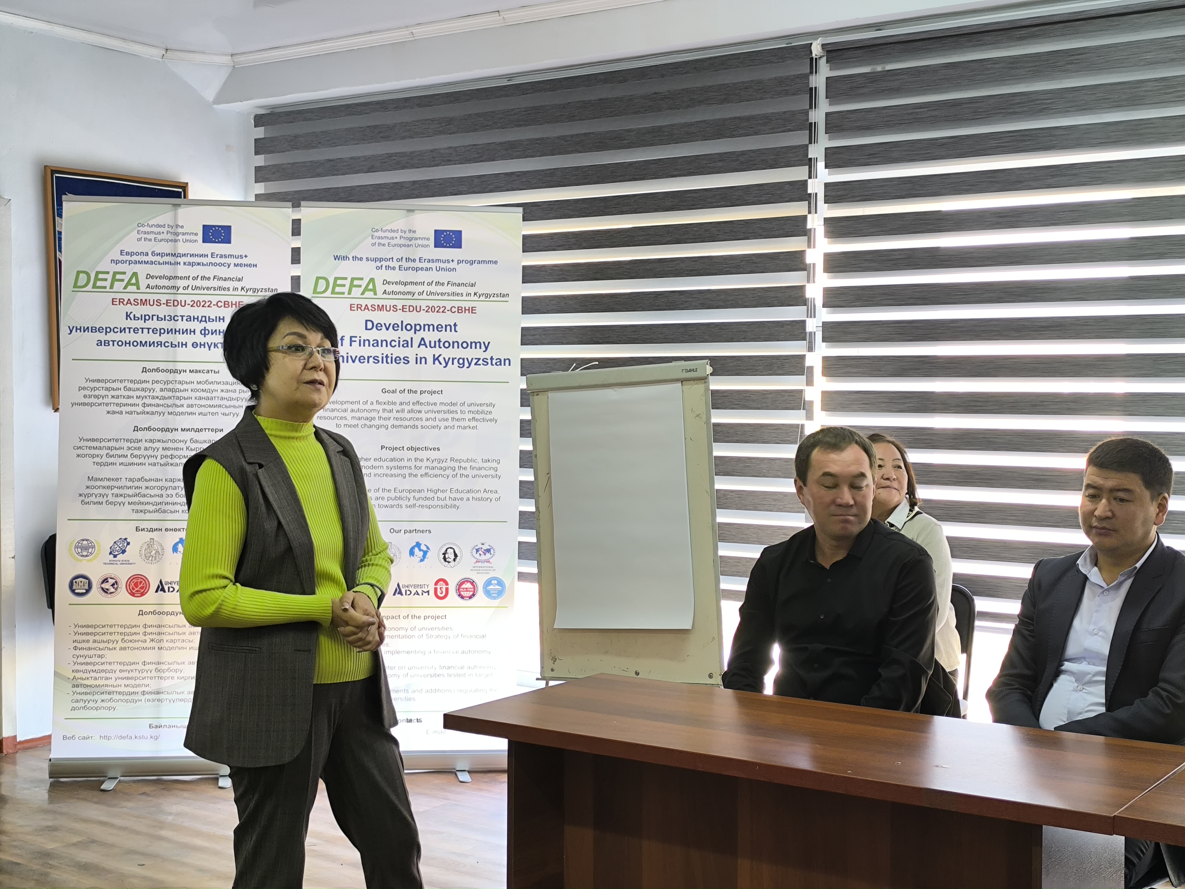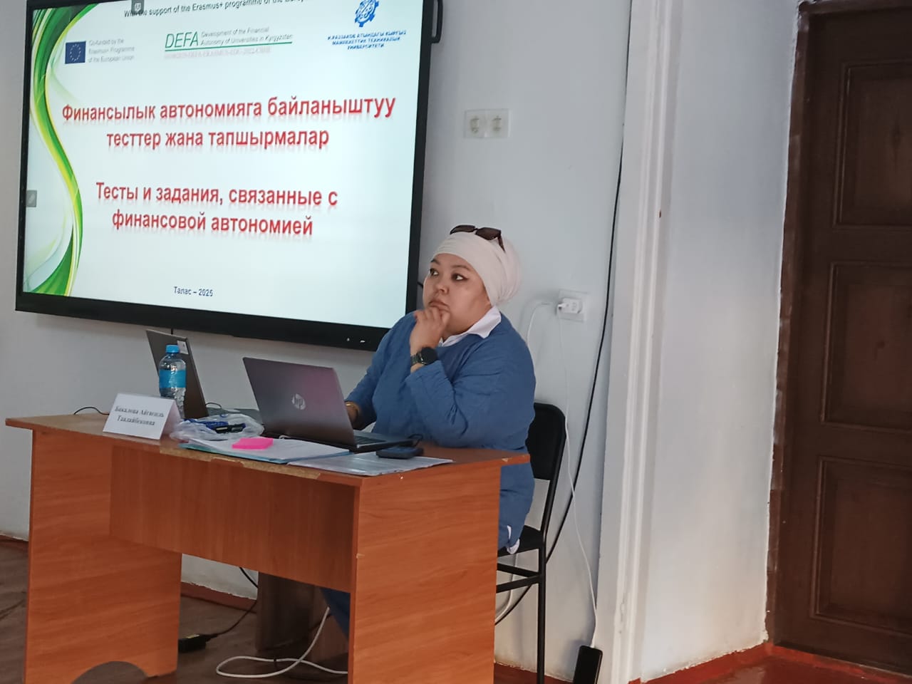 В Таласском государственном университете прошел семинар на тему "Финансовая автономия образовательных учреждений Кыргызстана" в целях распространения основных задач проекта DEFA: "Развитие финансовой автономии университетов Кыргызстана".
