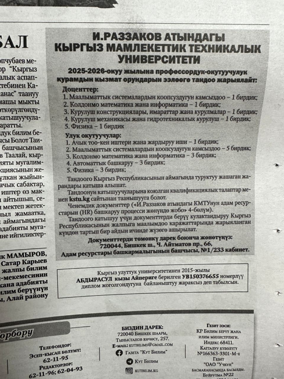 С квалификационными требованиями к участникам конкурса можно ознакомиться на сайте kstu.kg.