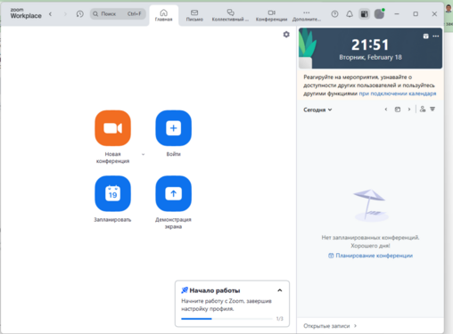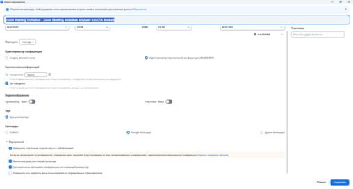 - Zoomдо жаңы иш-чара түзүңүз. Каттоо эсебиңизге кирип, «Конференцияны пландоо» дегенди тандаңыз. Анда күнүн, баштоо жана бүтүрүү убактысын, темасын жазыңыз. Коопсуздук үчүн паролдорду коюп, күтүү бөлмөсүн (зал ожидания) иштетүү сунушталат.