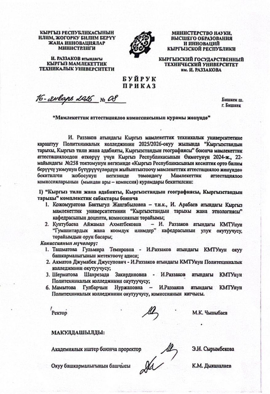- МАКтын курамын бекитүү жөнүндөгү КМТУнун 16.01.2026-ж. № 08 буйругу