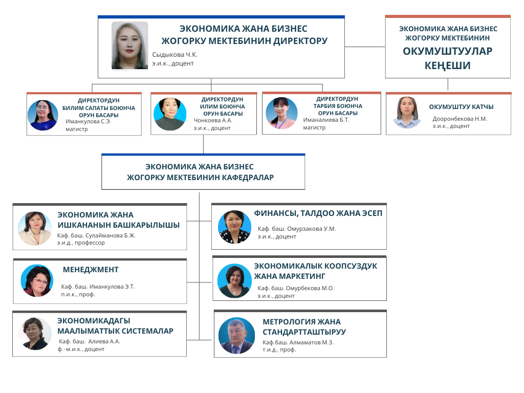 Экономика жана бизнес Жогорку мектебинин кафедралары 7 багыт боюнча бакалаврларды, 1 багыт боюнча адистерди, 5 багыт боюнча магистрлерди жана 3 багыт боюнча PhD докторанттарды даярдайт.