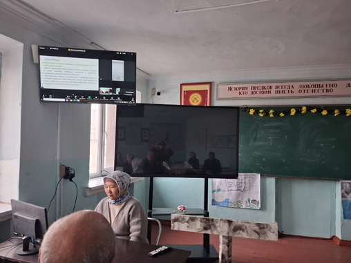 ЭУП кафедрасынын ага окутуучусу Чынара Акжоловна компьютердик панел колодонуу менен сабак отуп жаткан учуру.