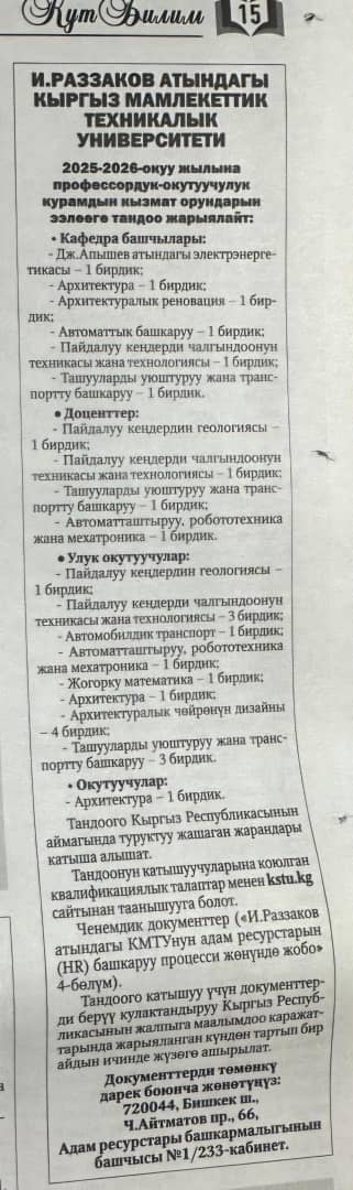И.Раззаков атындагы КМТУнун иш планы