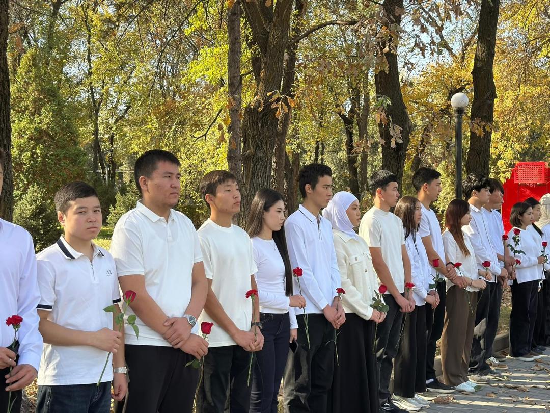 Иш-чара бир мүнөттүк жымжырттык жана эстеликке гүл коюу менен аяктады
