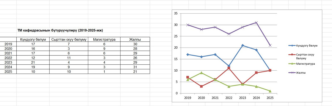 Кафедранын билим берүү программаларынын алкагында бул программалардын бүтүрүүчүлөрүнө ишке орноштуруу боюнча системалуу иштер жүргүзүлүүдө. Факультеттин жана университеттин деңгээлинде уюмдардын өкүлдөрү менен иш-чаралар, Бош орундар жарманкеси өткөрүлөт.