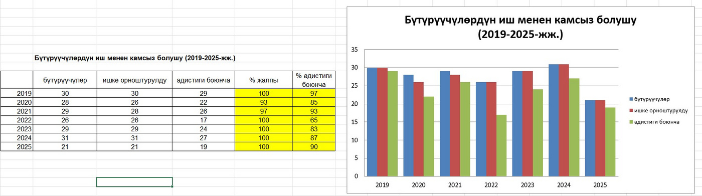 Кафедранын ОП бүтүрүүчүлөрү жергиликтүү ишканалар тарабынан да, ири эл аралык компаниялар тарабынан да суроо-талап жогору, мисалы, 2019-жылы "Кумтөр Голд Компани" ЖАК алтын ылгоочу фабрикасынын ар кандай кызматтарынын инженердик-техникалык кызматкерлеринин 4 вакансиясын ээлөө сынагында машина куруу технологиясы кафедрасынын бүтүрүүчүлөрү 3 позицияга тандалып алынган, бул бир жагынан билим берүү программасынын сапатынын жогорку деңгээлин, бүтүрүүчүлөрдүн эмгек рыногунда атаандаштыкка жөндөмдүүлүгүн чагылдырган маанилүү индикатор болуп саналат жана ошого жараша алардын ишке орношуусунун кепилдиги болуп саналат, экинчи жагынан. Төмөндө кафедранын билим берүү программаларынын бүтүрүүчүлөрүнүн ишке орношуусу боюнча статистикалык маалымат берилген.