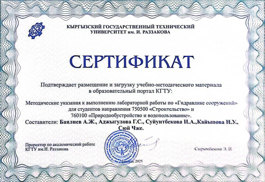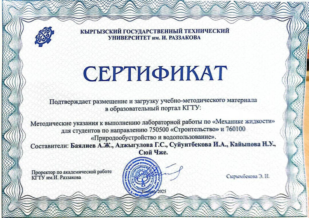 750500 «Курулуш» жана 760100 «Айлана-чөйрөнү башкаруу жана сууну пайдалануу» багыттары боюнча студенттер үчүн «Курулуштардын гидравликасы» боюнча лабораториялык иштерди аткаруу боюнча көрсөтмөлөр