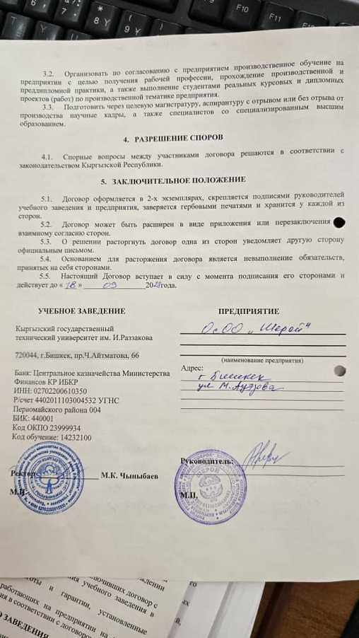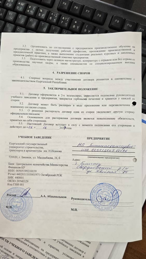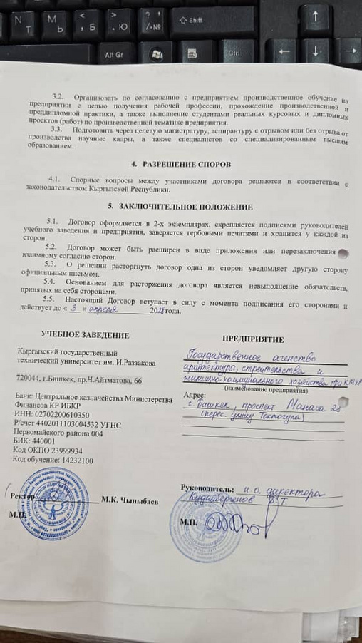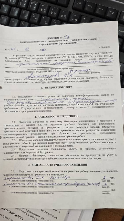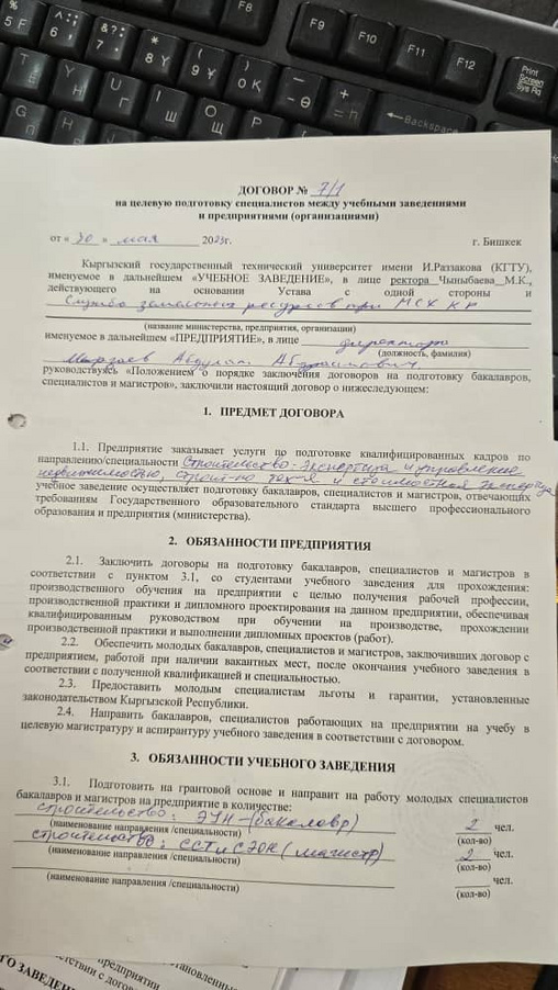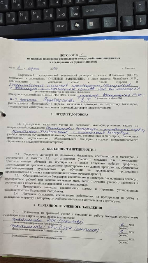 Кафедранын Студенттердин практика отусундо жана келечекте жумуш ордулары менен камсыз болуу максатында адистик боюнча ишканалар жана ондуруштор менен келишимдер тузулгон