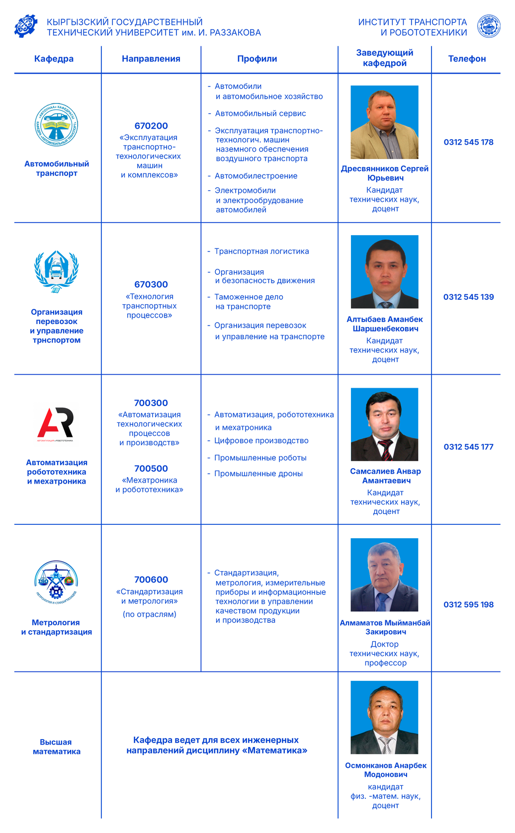 - к.т.н., доцент Абакиров С.А. – специалист в области автомобильного транспорта (1992-2004 гг.),