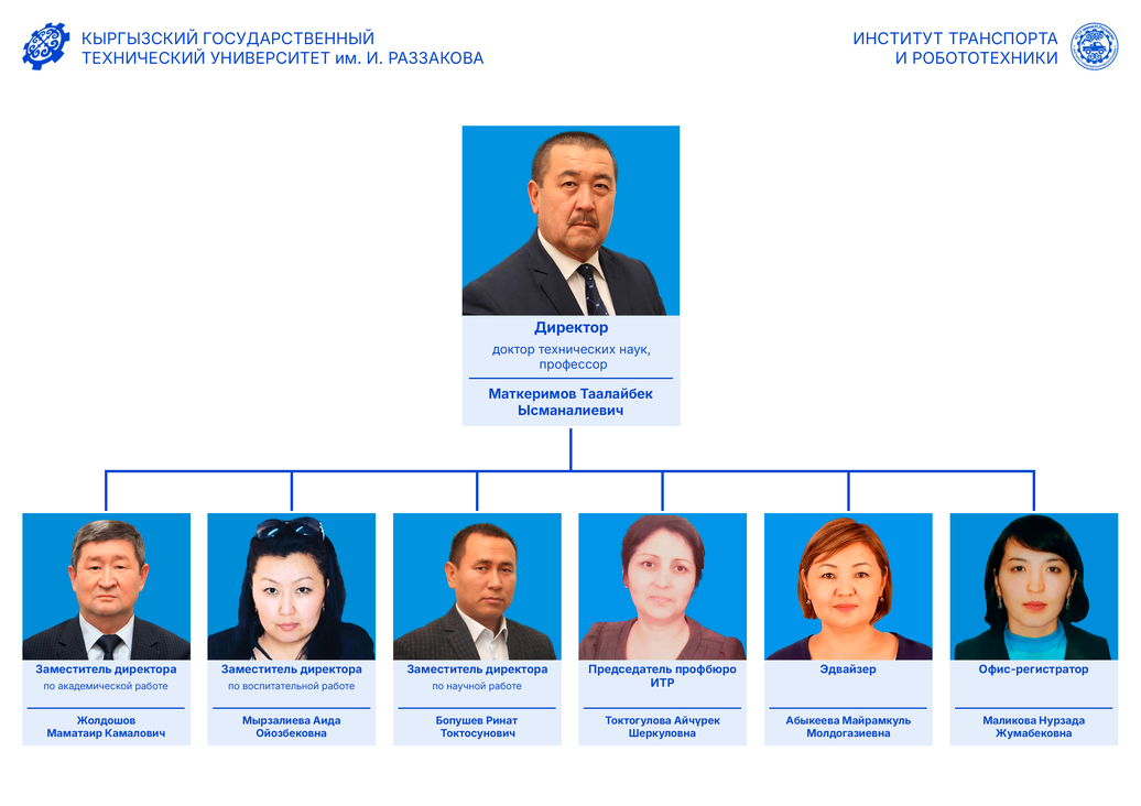 В настоящее время институт транспорта и робототехники возглавляет – доктор технических наук, профессор, академик Инженерной академии Кыргызской Республики (ИА КР), академик Международной Академии Педагогического образования (МАНПО), Почетный автотранспортник КР Маткеримов Таалайбек Ысманалиевич