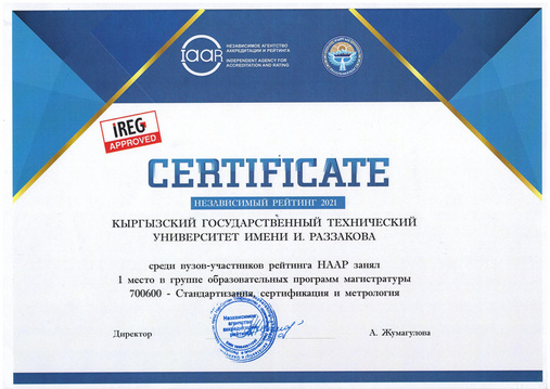 По итогам независимого национального рейтинга НААР (Независимое агентство аккредитации и рейтинга — IAAR) за 2021 год Кыргызский государственный технический университет имени И. Раззакова занял 1-е место среди вузов-участников по образовательной программе 7000600 — Стандартизация, сертификация и метрология.