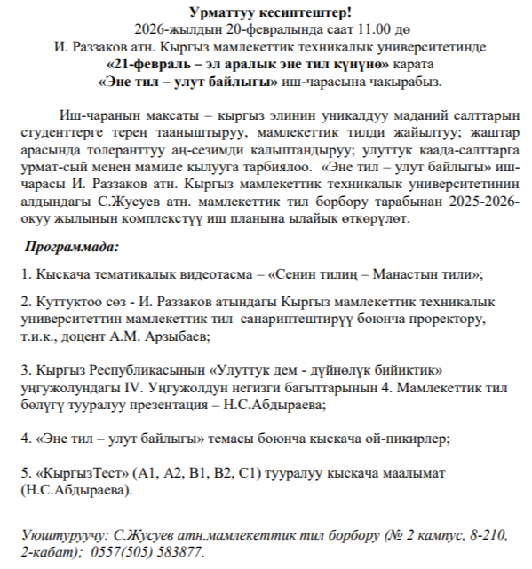 План работы КГТУ им.И.Раззакова